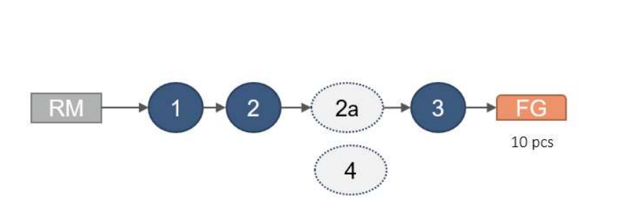 For example, the production of a finished good (FG) has a default route that includes operations 1, 2, and 3 in a sequential order. If operation 2 develops a defect during production, optional operations 2a (linked) or 4 (unlinked) can be activated as an alternative route. When operation 2 becomes functional again, you can switch from the optional operation to the default operation.