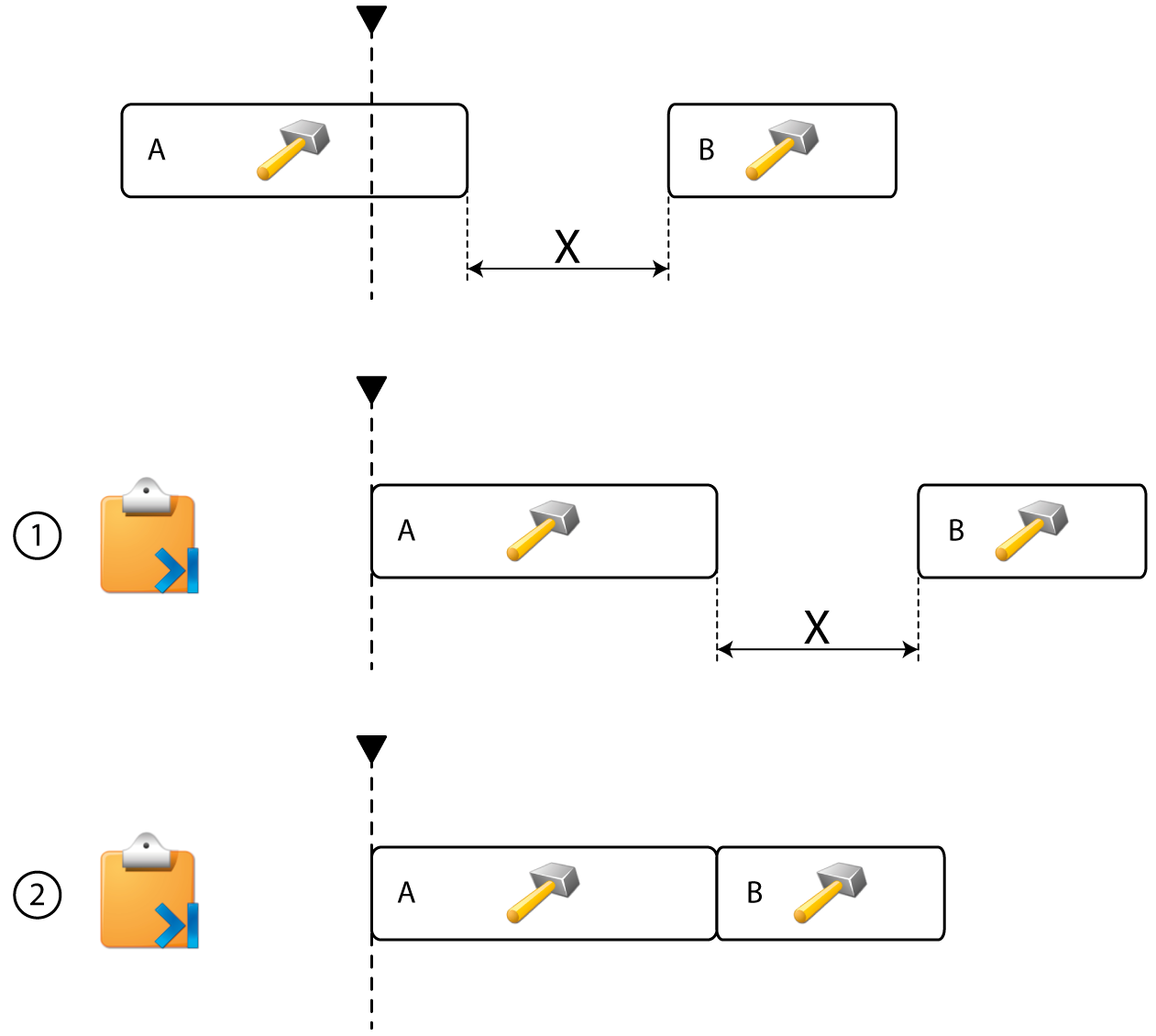 When actualizing the planning all the operations that are still not active but which are planned for before the current time, are moved to the current time, taking into account any set delays. Depending on the settings, the unplanned time (X) will be retained (1) or not retained (2). See Retain gaps when moving delayed activities to the current timestamp.