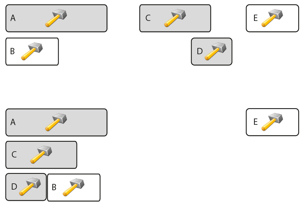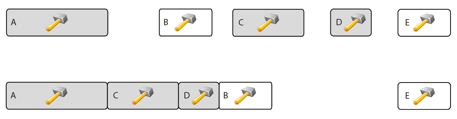 If a parallel planning mode was set, the grouped jobs will be distributed over the different capacities in the most optimal way with the 'Planned Start' of the job as start date. If insufficient capacity is available, the job will be moved to the first available time slot. Any operations (B) lying in between the grouped operations will be moved in the planning afterwards.Figure: Group operations for a resource with a parallel planning mode