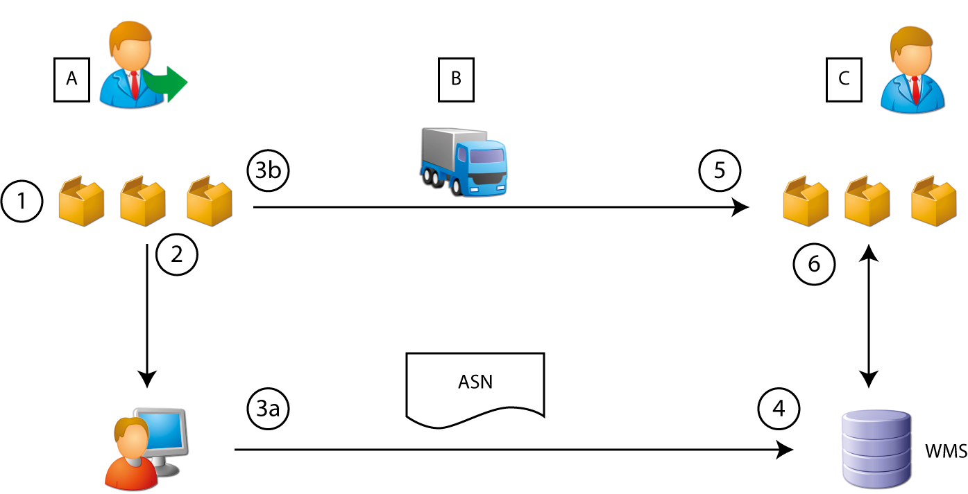 (3a): An ASN is sent to the customer (C) to notify them of the sending.
