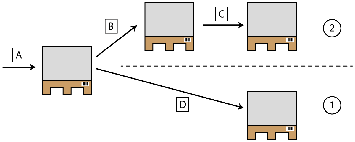 - 1 step receipt or blind receipt (1): You receive the goods concerned and Objective WMS searches for the matching ASN data (D).