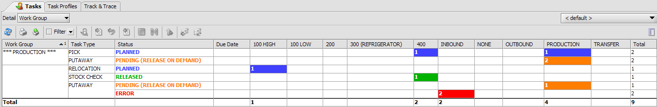 All planned, released and to be executed tasks for warehouse operators (tasks for receipts, orders, shipments, stock counts,...) are displayed in the Task Management screen. The Task Management screen displays an overview of the workload per work zone and the progress of the work.